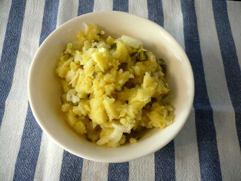 Ve slupce předem uvařené, oloupané a vychladlé brambory prolisujeme do mísy. Přidáme oloupanou, jemně nasekanou cibuli a nadrobno nakrájené okurky.