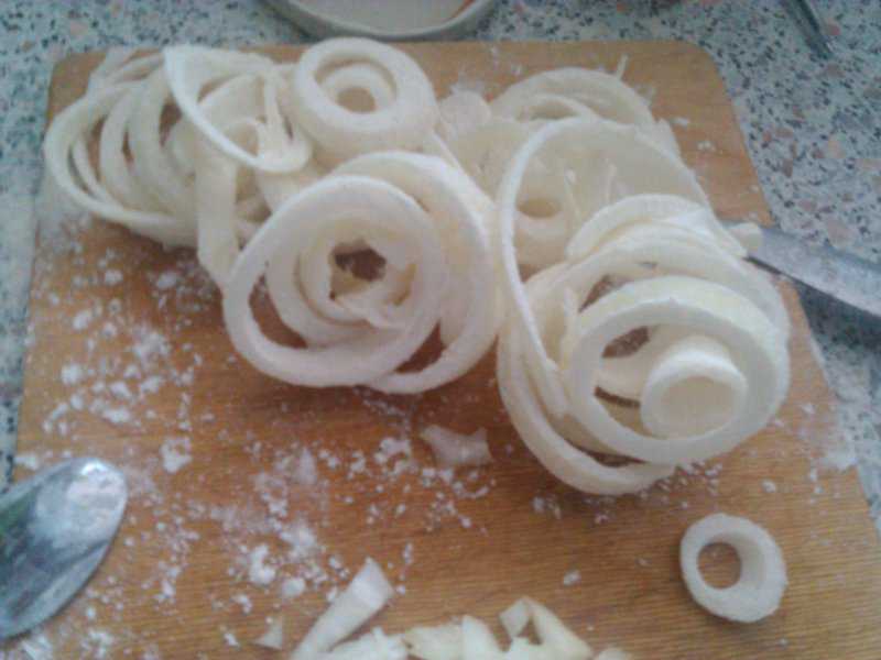 Cibuli nakrájíme na kolečka a rozebereme ji na jednotlivé kroužky. Obalíme ji v hladké mouce a smažíme na oleji.
