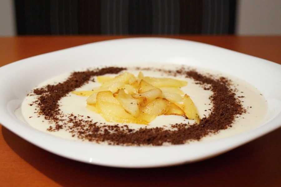 Kaši nalijeme na talíře.Poklademe na plátky nakrájenými a na pánvi opečenými jablky.Posypeme moučkovým cukrem a nastrouhanou čokoládou.