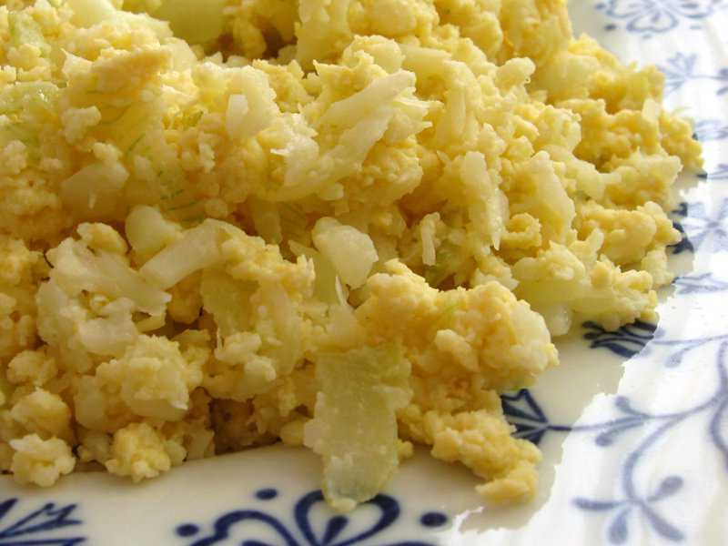 Pak květák zalijeme rozmíchanými vejci, ochutíme solí a promícháme, dokud se vejce nesrazí.