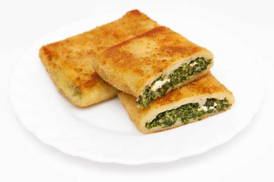 Každou palačinku potřeme špenátovou náplní, složíme do obdélníku a obalujeme v mouce, rozšlehaném vejci a strouhance.